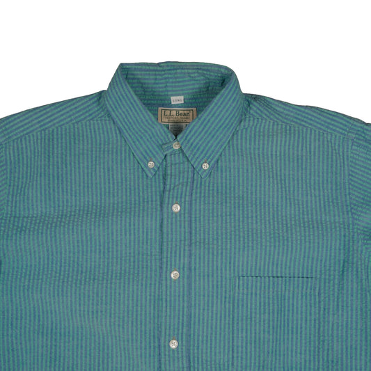 Vintage LL Bean Men’s Large Short Sleeve Button Down Blue Green Stripe Made in USA