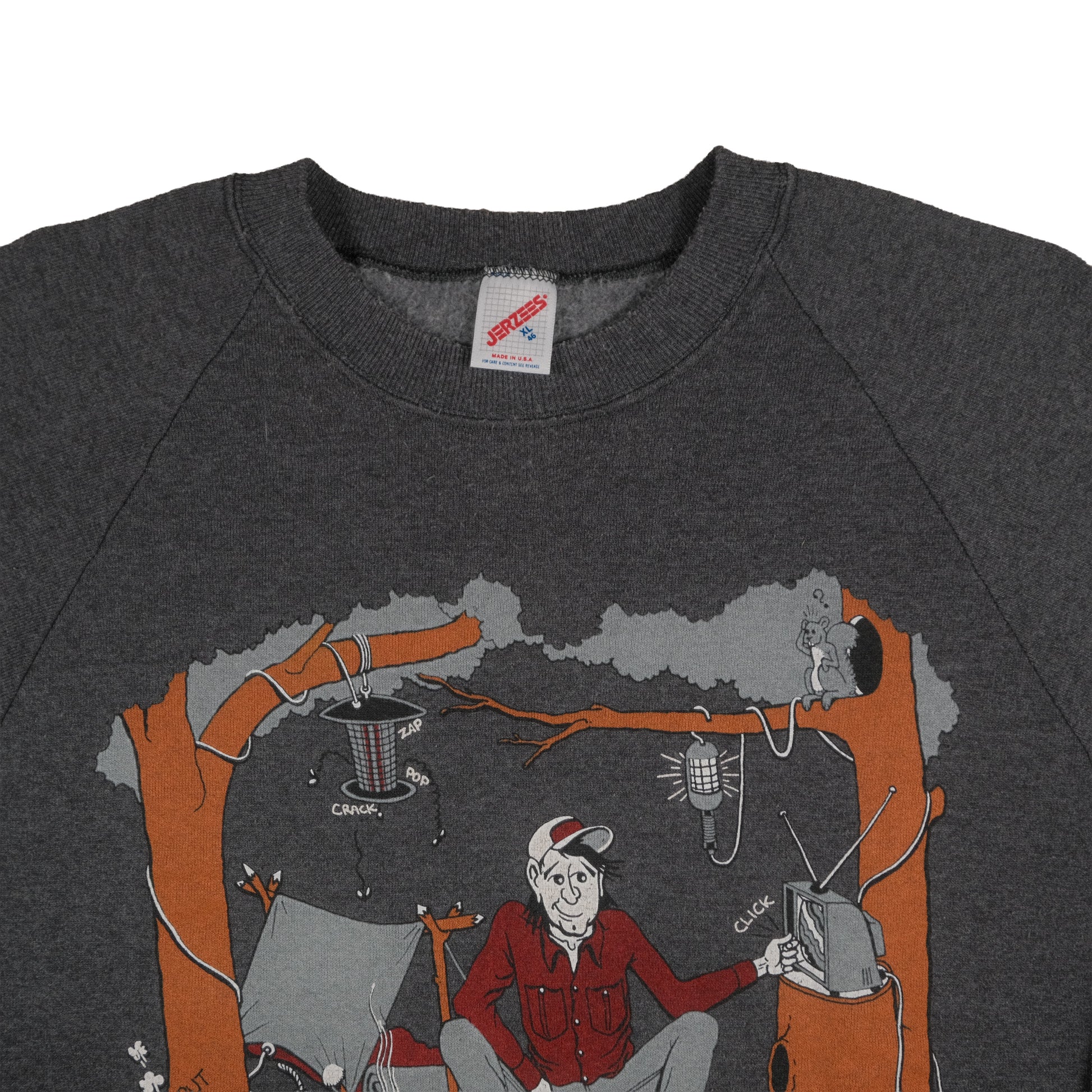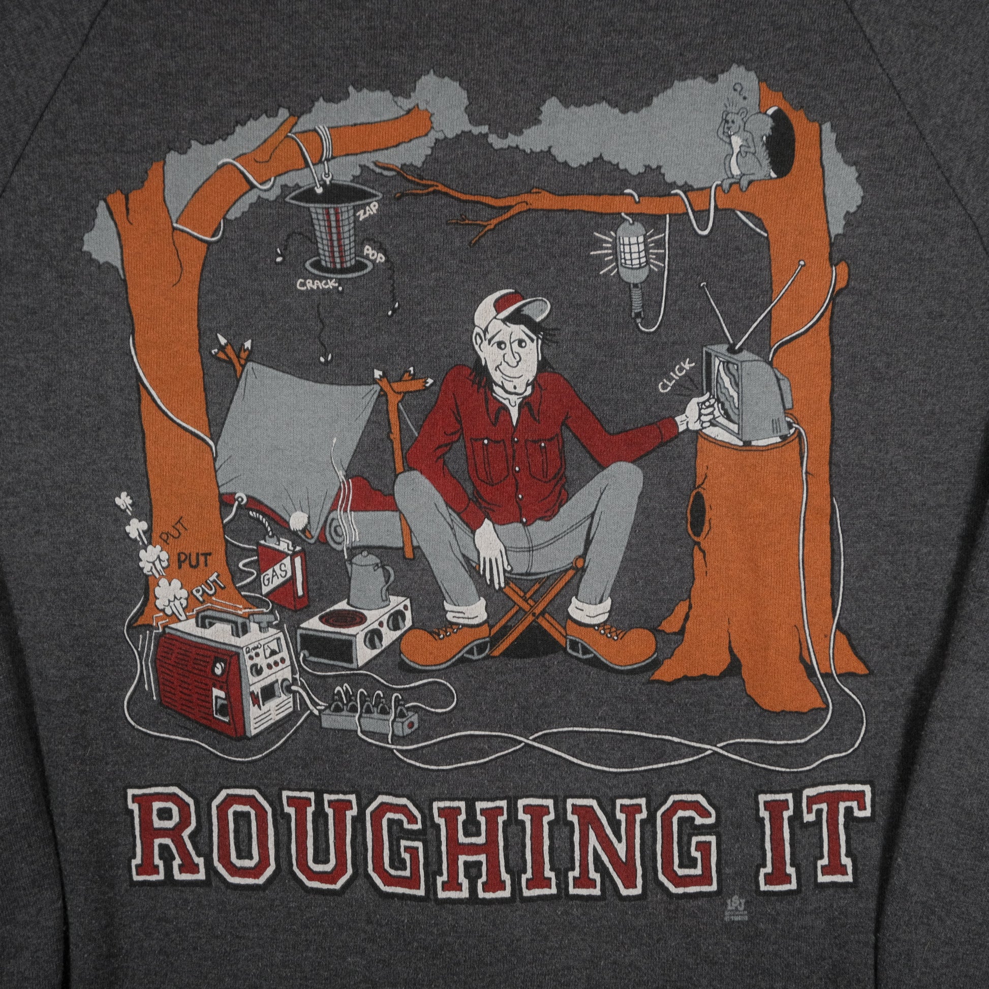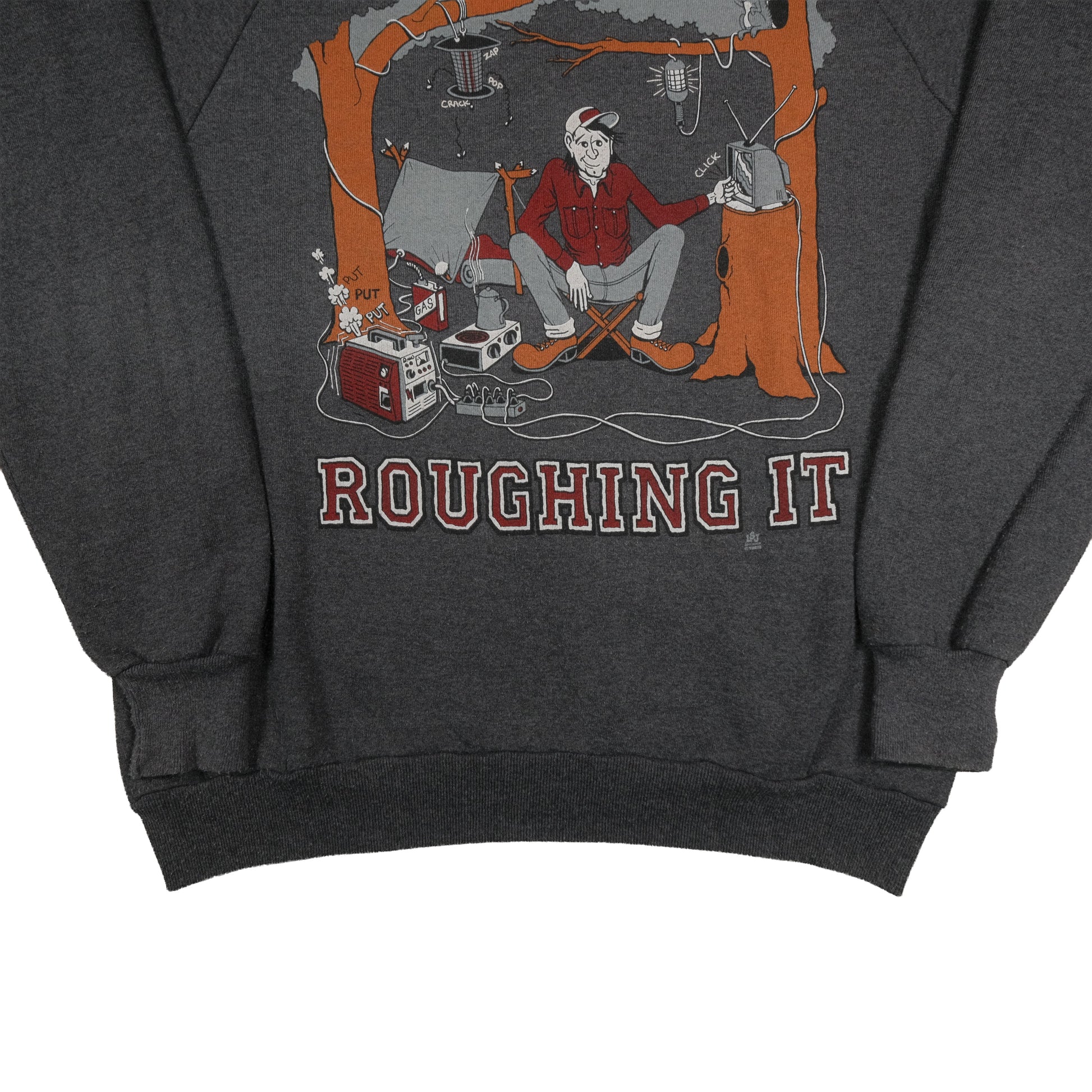 Vintage 80’s Jerzees Roughin’ It Camping Joke Raglan Sweatshirt Adult L USA Made Gray