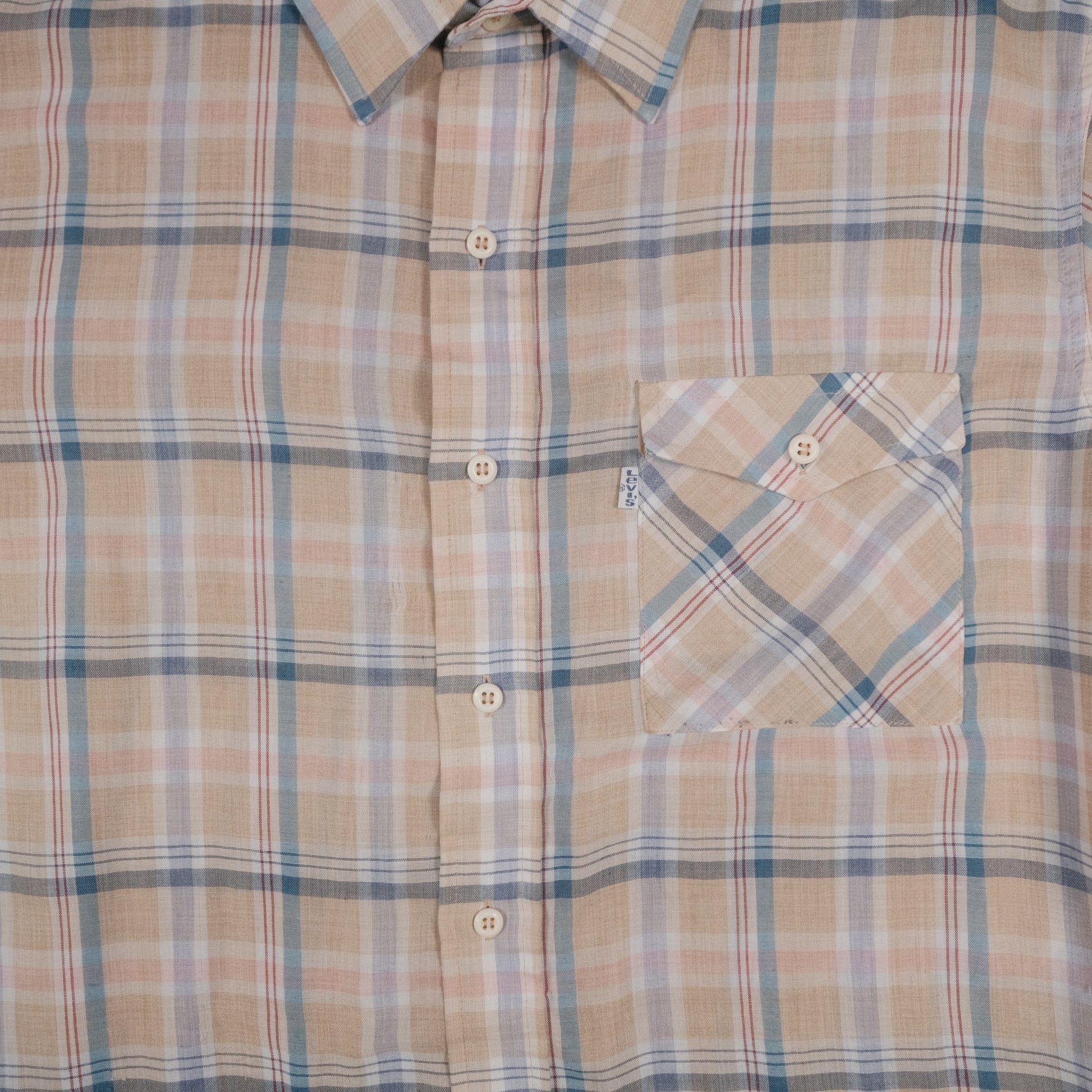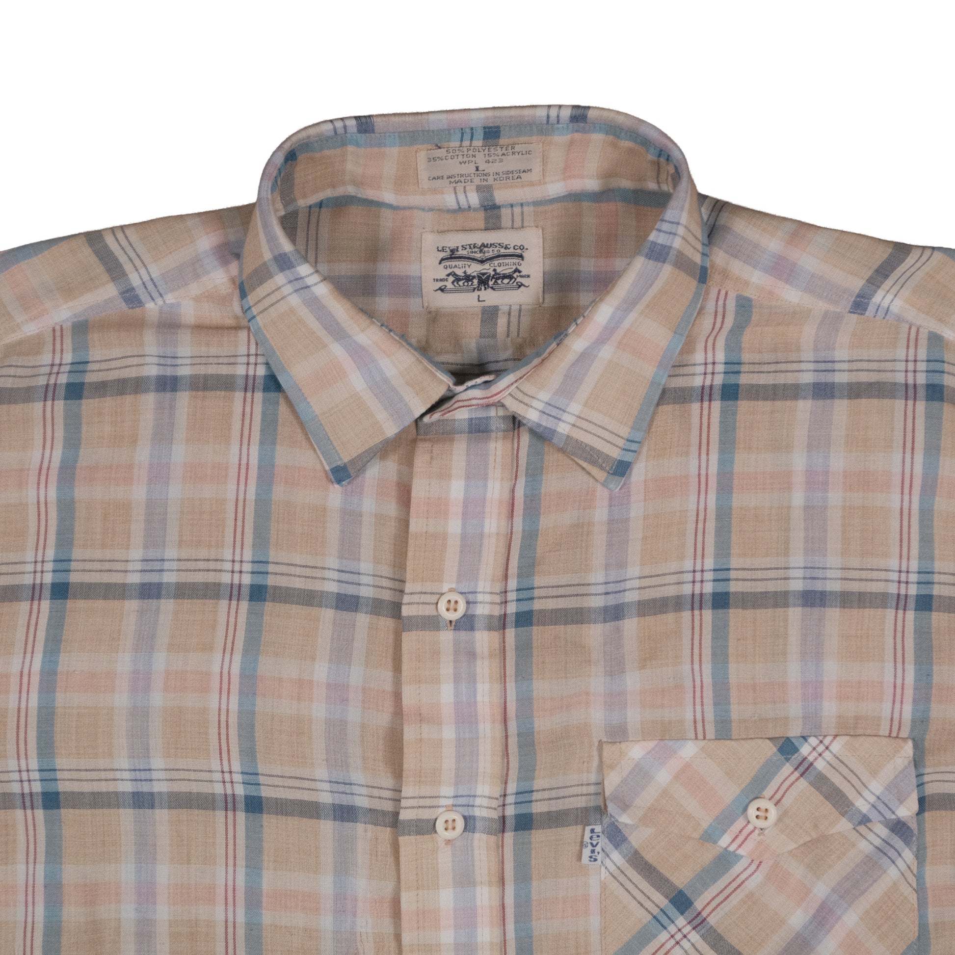 Vintage 70’s Levi’s Short Sleeve Button Up Tan Plaid Men’s Large Made in Korea Flap Pocket