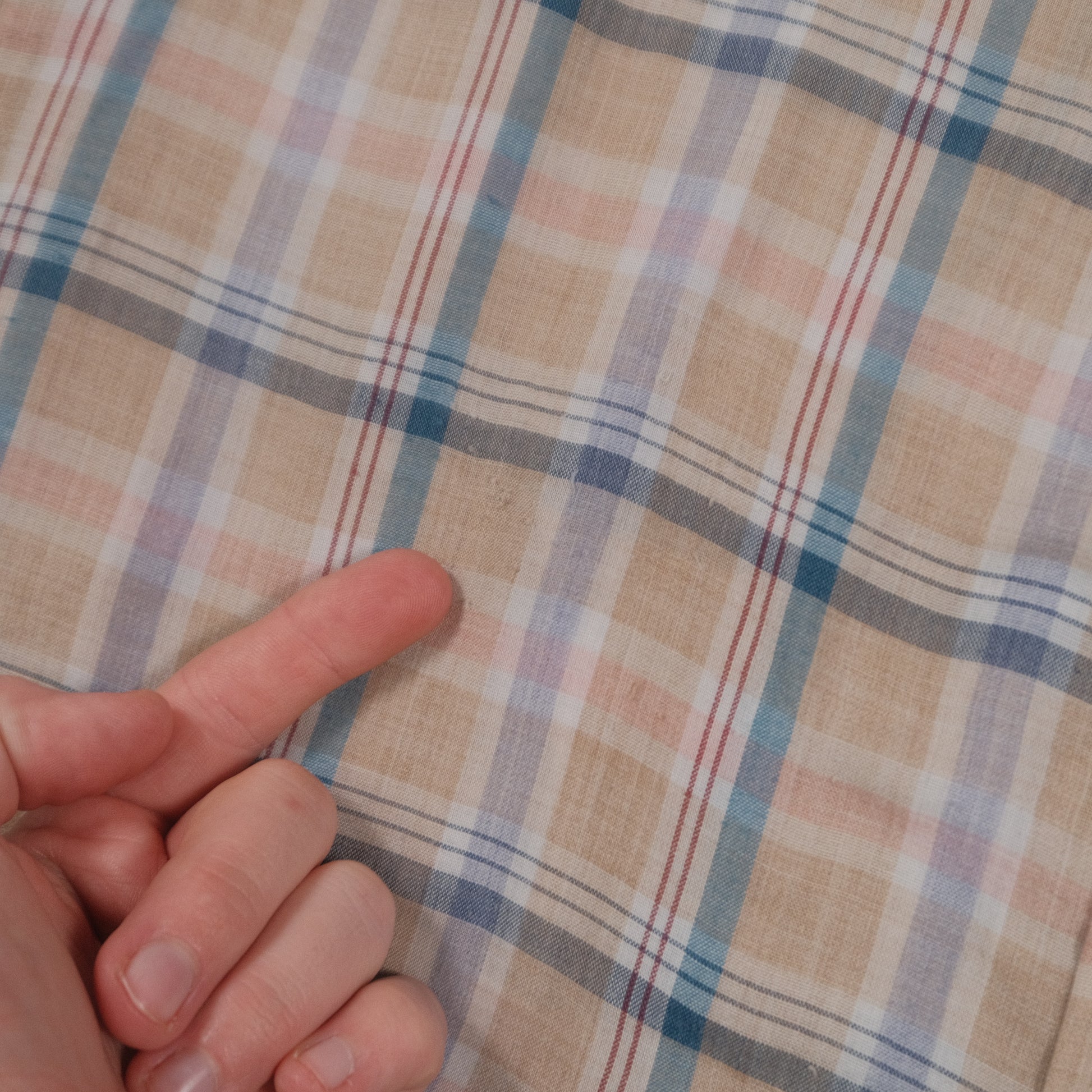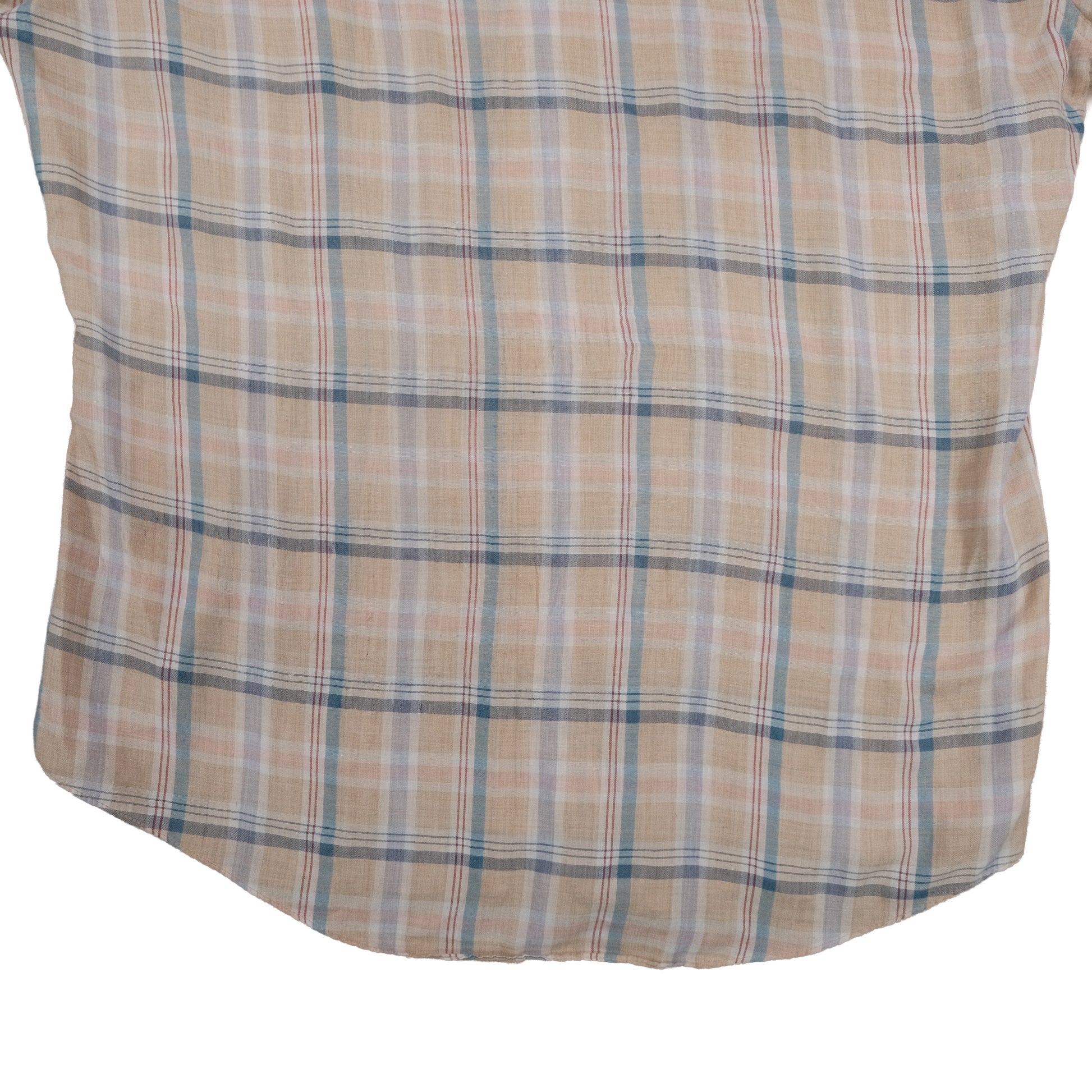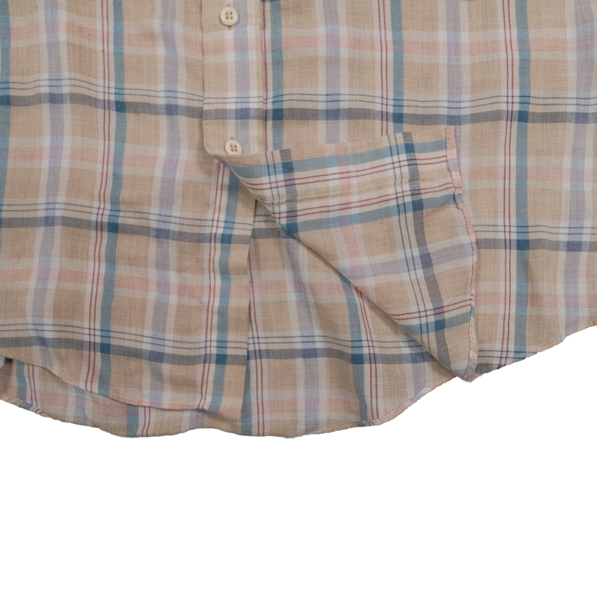 Threadbare in spots and has what looks like pen staining in pocket. Very soft, paper thin. Each item is vintage and has signs of wear which may include discoloration, fading, pilling, or distressing. Please examine each photo carefully before purchasing. What you see is exactly what you will receive. Our goal is to give you the best experience possible, so please let us know if you have any questions. All items are measured by hand so please allow for slight variance.