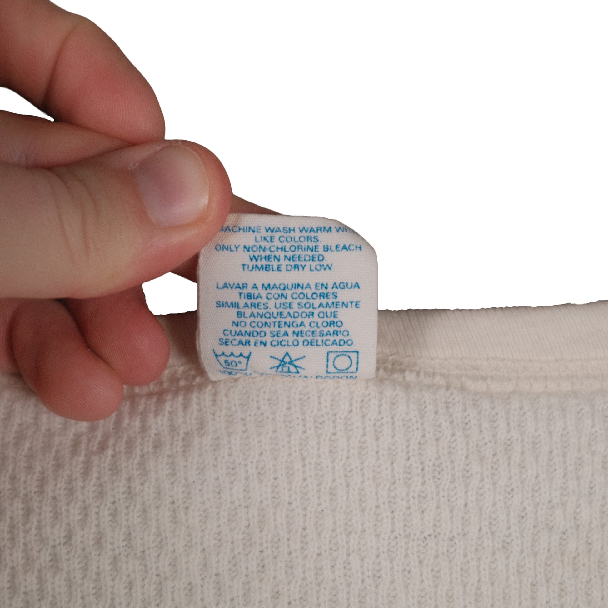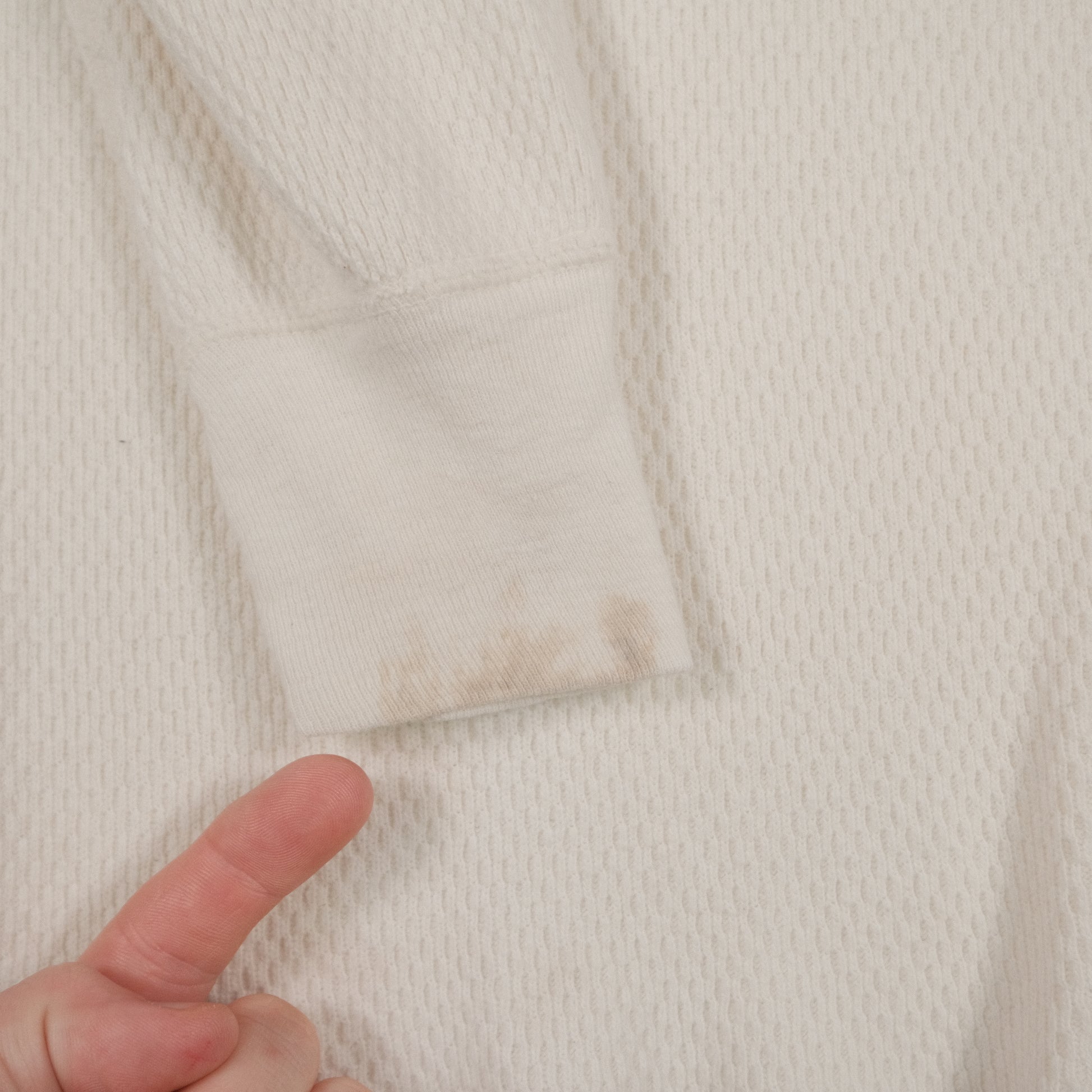 Tag says Large but sizing is closer to Medium. Has staining on both sleeves and a few near bottom hem. Each item is vintage and has signs of wear which may include discoloration, fading, pilling, or distressing. Please examine each photo carefully before purchasing. What you see is exactly what you will receive. Our goal is to give you the best experience possible, so please let us know if you have any questions. All items are measured by hand so please allow for slight variance.